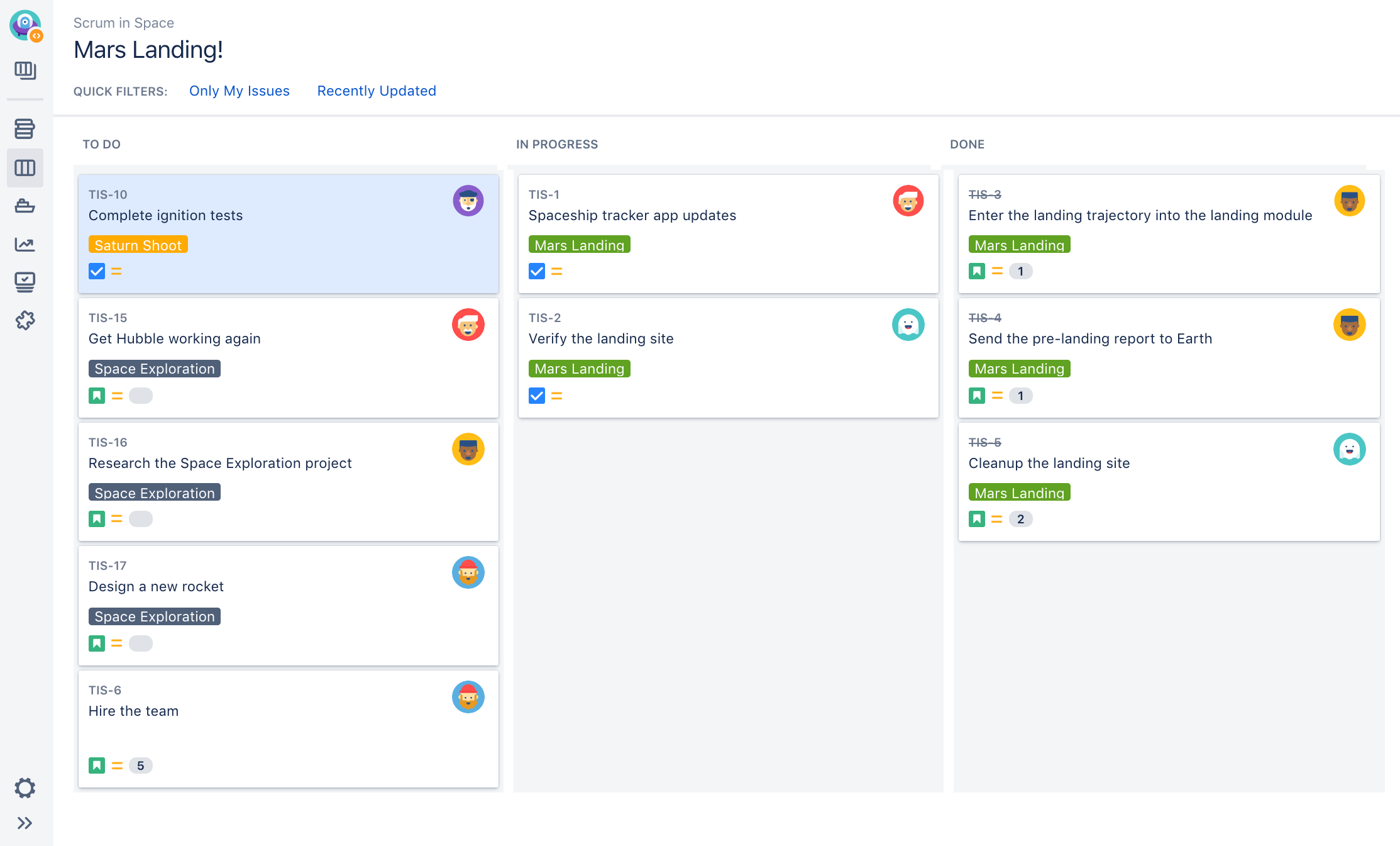 This JIRA board is an example of a Kanban system. It has different stages of work (todo, in progress, done) and it uses visual signals (tickets).